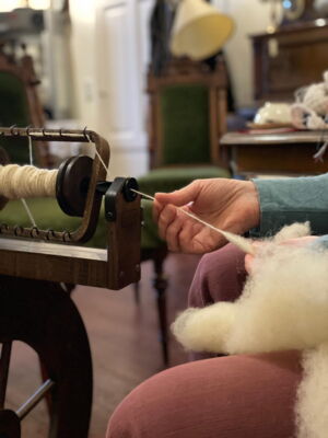 - Spinnen der kardierten Wolle an einem Spinnrad